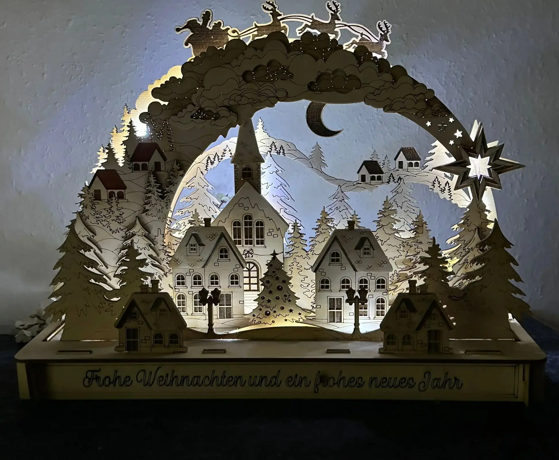 Die Teile werden aus 3 mm starkem Birkenholz gelasert und anschließend in Handarbeit zusammengesetzt. Dadurch entsteht ein fein gearbeitetes Motiv, das stabil und zugleich filigran wirkt. Auf der vorderen Platte ist die Gravur „Frohe Weihnachten und ein frohes neues Jahr“ zu lesen – ein dezentes Detail, das den Schwibbogen noch festlicher macht.